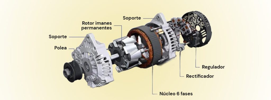 - Estátor: Bobinas ubicadas en la parte fija del alternador que generan la corriente eléctrica necesaria cuando se ven afectadas por el campo magnético del rotor.
